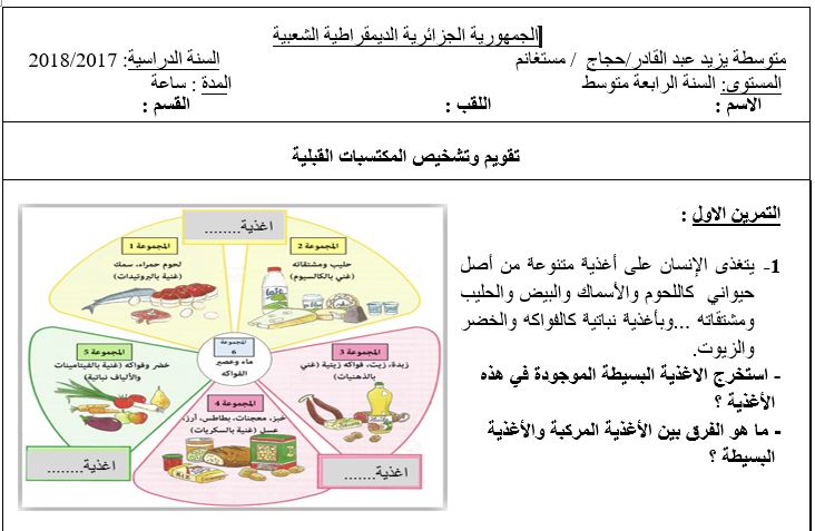 تقويم تشخيصي في مادة العلوم الفيزيائية و التكنلوجيا سنة 4 متوسط مدونة التعليم في الجزائر