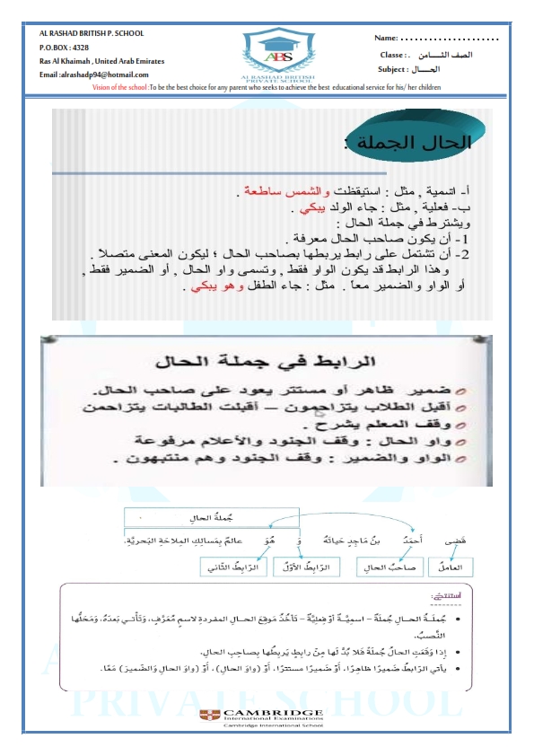 ورقة عمل درس الحال مع الحل لغة عربية صف ثامن فصل أول مدرستي الامارتية