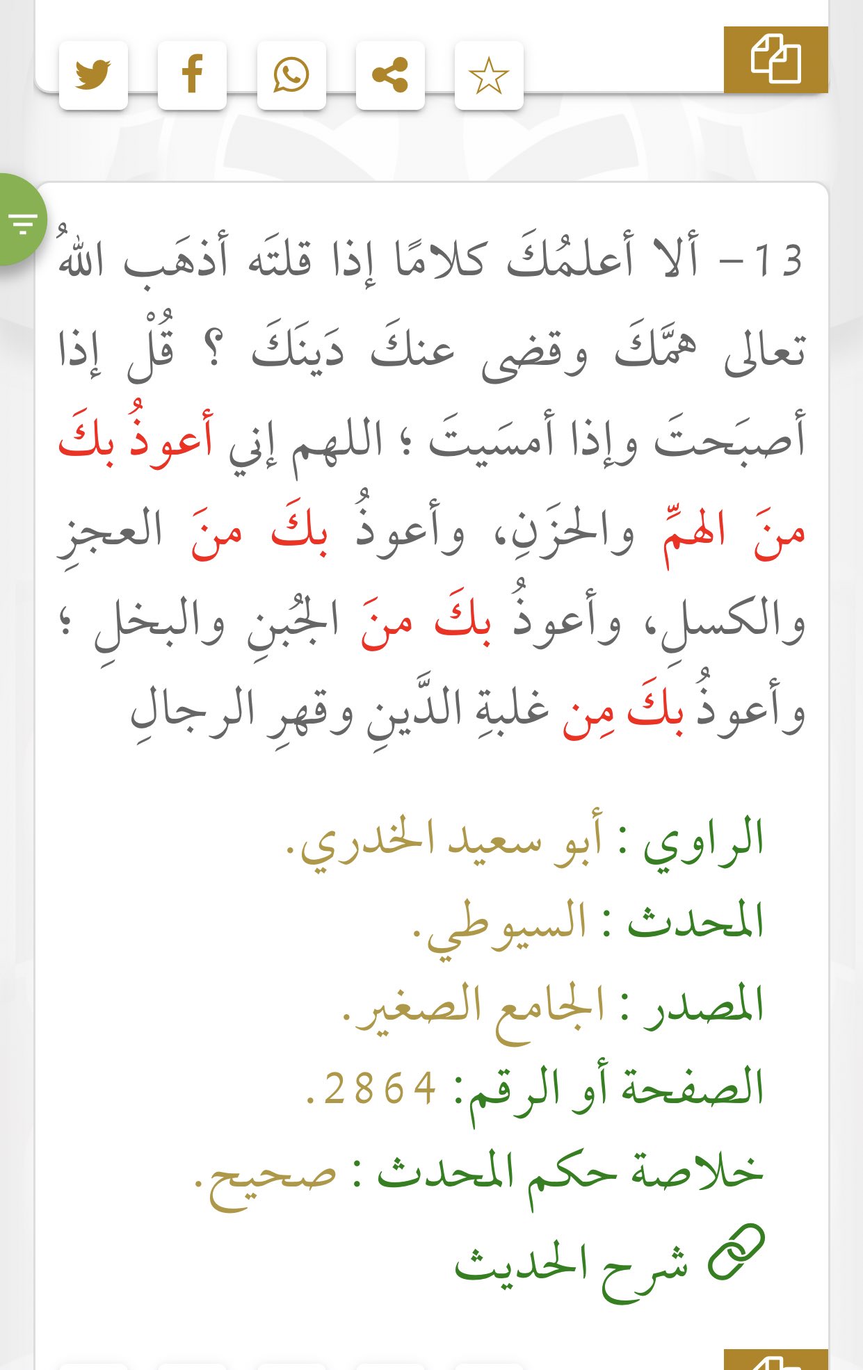 الل ه م إ ن ي أ ع وذ ب ك م ن ال ه م و ال ح ز ن و أ ع وذ ب ك م ن ال ع ج ز و ال ك س ل و أ ع وذ ب ك م ن ال ج ب ن و ال ب خ ل و أ ع وذ ب ك م ن غ ل ب ة الد ي ن و ق ه ر الر ج ال. شرح الدعاء اللهم اني اعوذ بك من الهم و الحزن. كان رسول الله صلى الله عليه وسلم يقول. اللهم إني أعوذ بك من الهم والحزن والعجز والكسل والجبن والبخل وضلع.