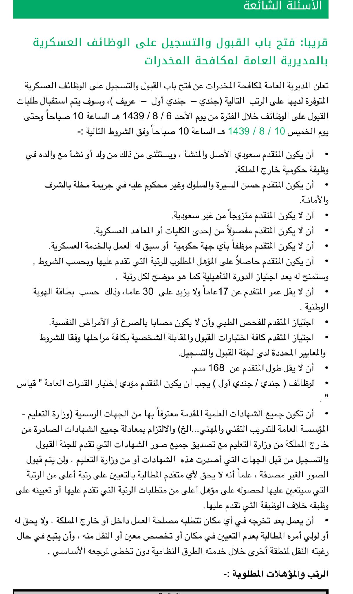 وظايف عسكريه On Twitter مكافحة المخدرات تعلن المديريه العامه لمكافحة المخدرات عن فتح باب القبول والتسجيل لرتب جندي وجندي اول وعريف ابتداء من الاحد ١٤٣٩ ٨ ٦ الساعه ١٠ صباحا وحتى يوم الخميس ١٤٣٩ ٨ ١٠